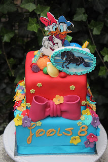 Deze super vrolijke taart was voor Jools ze werd 8 jaar. Hier zie je dat je een taart helemaal naar de wens van de Jarige kan maken, dus met t zwarte paard maar dat het ook een gezellige taart is en blijft met alleen donald en katrien...je kan dus alle kanten op...de taart is altijd een groot feest daar zorg ik voor!